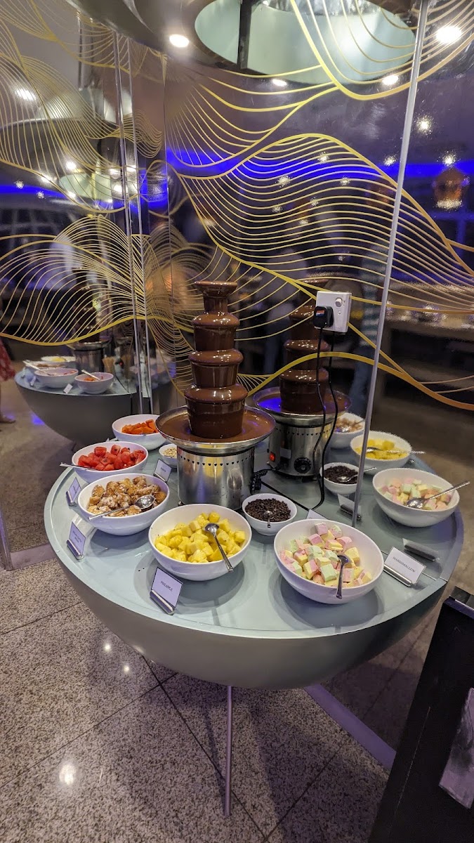 The buffet-style setup is both inviting and reassuring, offering familiar comforts like savory kottu and crisp dumplings alongside unexpected delights such as a chocolate fountain and delicate sushi — each plate a small chapter in Colombo’s rich food story. The gentle motion of the revolving floor means you don’t just watch the city; you feel connected to it, as if the evening itself unfolds naturally, one panoramic moment at a time.